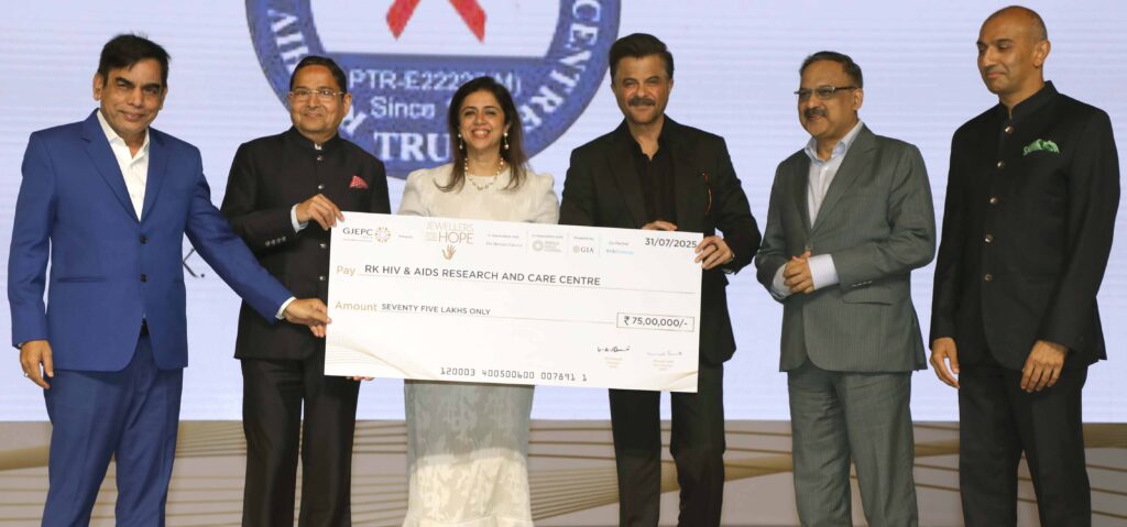 In a proud moment for the healthcare and social service community, legendary Bollywood actor Anil Kapoor, along with GJEPC Chairman Kirit Bhansali, Vice Chairman Shaunak Parikh, and former Mumbai Police Commissioner Vivek Phansalkar, presented a ₹75 lakh cheque to Dr. Dharmendra Kumar, founder of R.K. HIV AIDS Research and Care Centre, at a special ceremony held at the Jio World Convention Centre, BKC, Bandra (W).